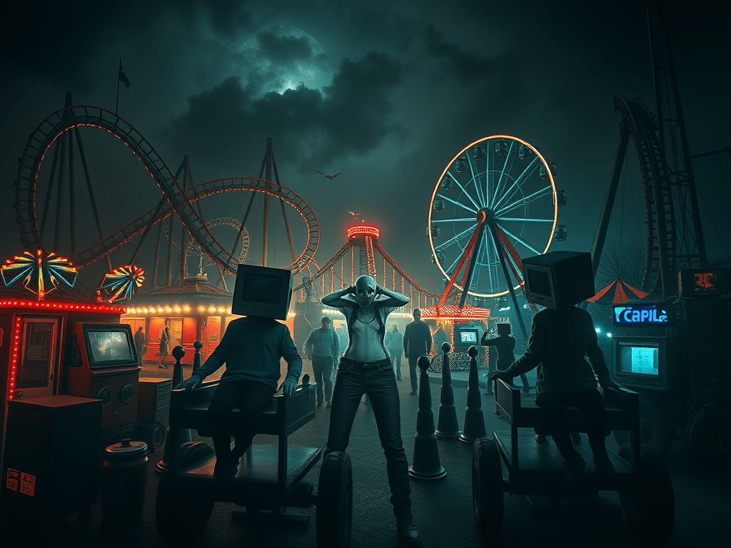 Man ist wie gefangen in den Fahrgeschäften, ( Achterbahn, Riesenrad etc. ) die die Erinnerungen an Kindheitstraumata wecken, und die Spieler auf eine schreckliche Reise in die Vergangenheit mitnehmen. Die Köpfe der Protagonisten sehen aus wie Kisten oder Computer. Ich habe schnell einen Mix zwischen Verlockung (Computerspielen und Enge/Gefangensein assoziiert. Ich frage mich, ob es einen Ausbruch gibt, oder ob man als Spielerin in der Komplizenrolle bleiben muss…Und obwohl ich mich in dieser Rolle unbeharglich fühle, spiele ich weiter…Und lasse mich einfangen.